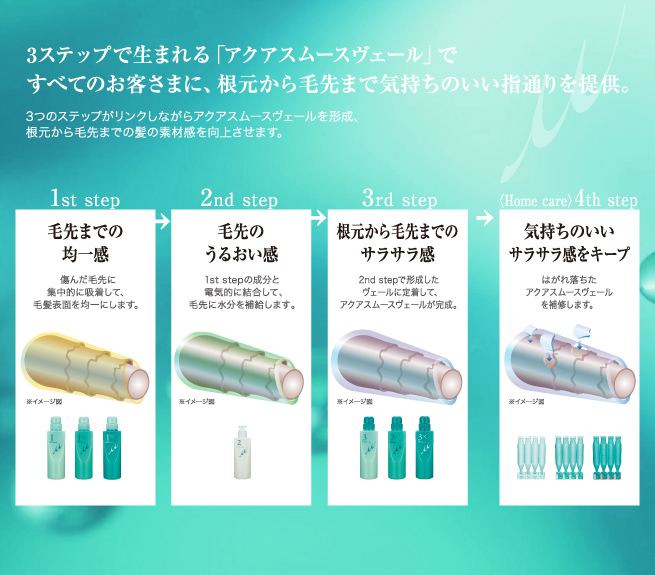 1「均一感」、2「うるおい感」、3「サラサラ感」でアクアスムーズヴェールを形成します。
