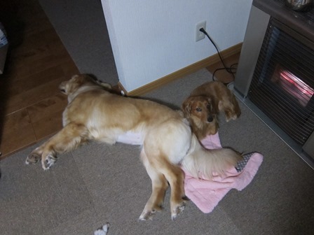 ストーブ前の場所取り合戦はいつものこと。