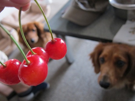 かわいいはずワンですが、獣の顔してチェリーを狙ってます。