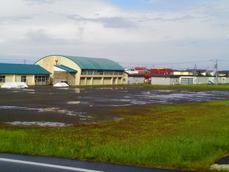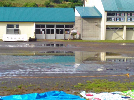 日曜の朝散歩の時、ちょっと青空ものぞいてますが、グランドは水びたし、、。