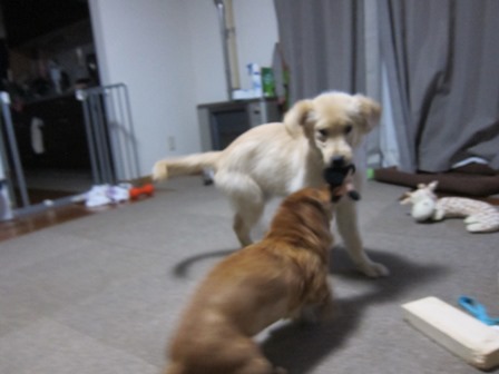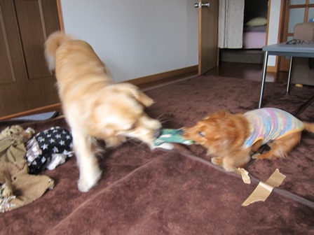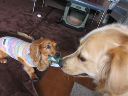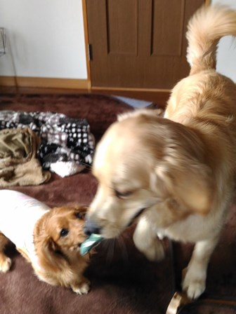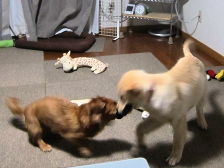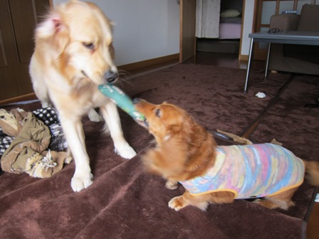早速ジルとシェルパに渡したら、久々に、二人で引っ張り合って遊びました。