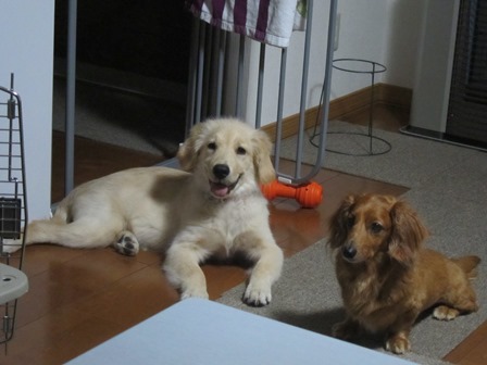 シェルパがまだ子犬で、ジルと同じくらいの大きさの時は、よく二人で引っ張り合い遊びしてました。でもシェルパが大きくなった最近は全然二人で遊ばなくなった、、、まぁ歳の差、力の差?、仕方ないですよね。