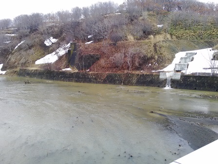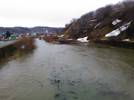 雪解け水で、オンネ川の水位がすごい、川幅いっぱいです。