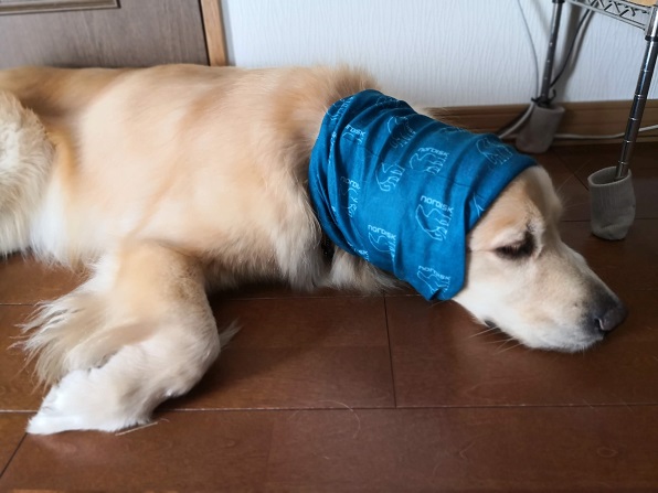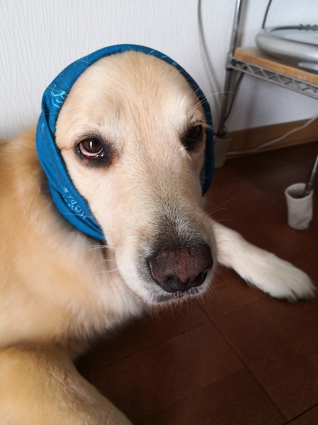 犬用の消毒系の液体でふき取って、乾燥させるために、耳回りに巻いてみました。