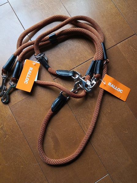 それと、留め具が二つありるリードで、首輪とハーネスをつなぎます。このスタイルは以前から二頭引きリードを使ってしてました。やっぱりどちらかのすっぽ抜け防止のためにです。