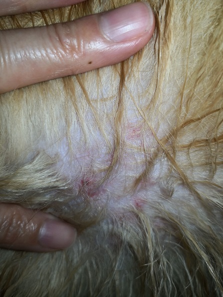 結構前の話ですが、シェルパが左胴体辺りを、しきりに足で搔いたり、口でかじったりしてたので、よく見てみると、赤いブツブツがカサブタみたいになってました。